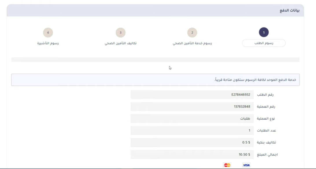 - التأكد من سداد رسوم التأمين الصحي ورسوم الطلب والتأشيرة.