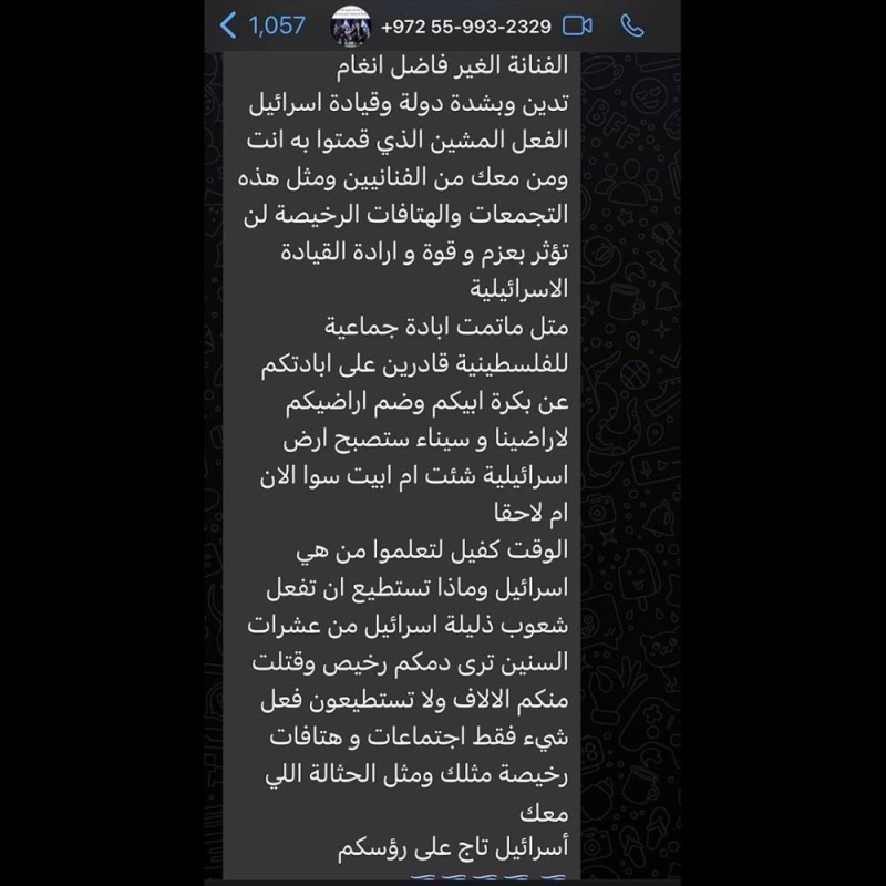 صرحت الفنانة المصرية أنغام مساء أمس عن تلقيها رسالة تهديد شخصية عبر الهاتف الخاص بها من قبل مصادر إسرائيلية وشملت الرسالة تهديد خطير ولكنه يحمل محتوى وصفته أنغام بأنه "حقير".