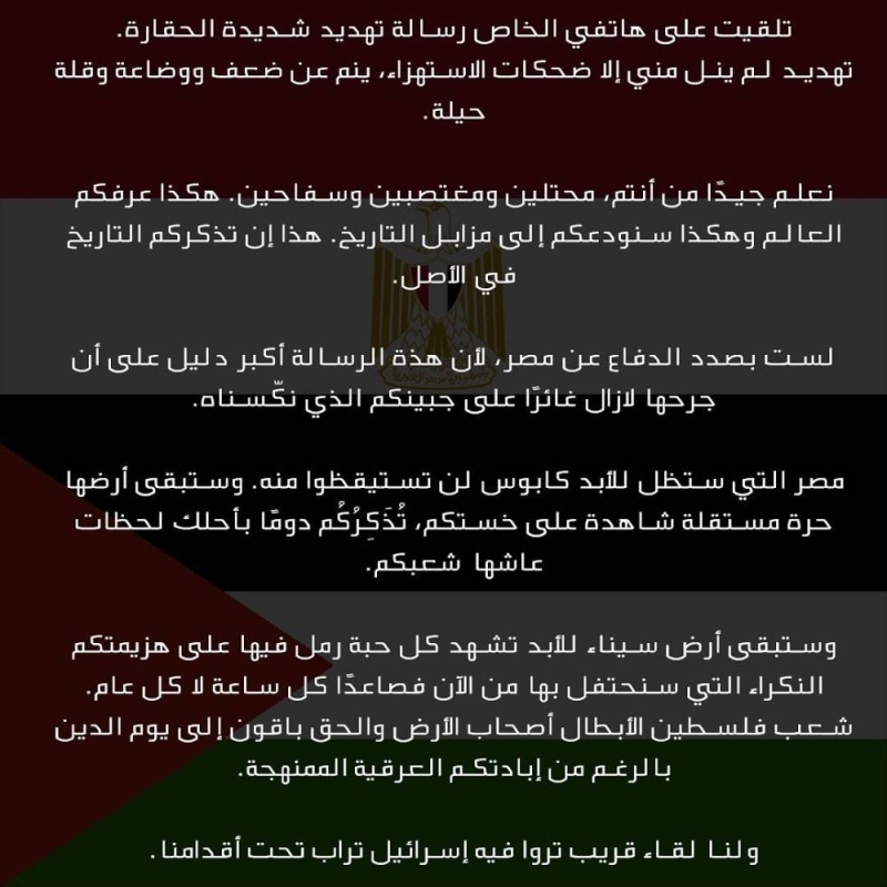 وتابعت أنغام اعتراضها قائلة "لست بصدد الدفاع عن مصر لأن هذه الرسالة أكبر دليل على أن جرحها لا يزال غائرًا على جبينكم الذي نكسناه مصر التي ستظل للأبد كابوسًا لن تستيقظوا منه، وستبقى أرضها حرة مستقلة شاهدة على خستكم".