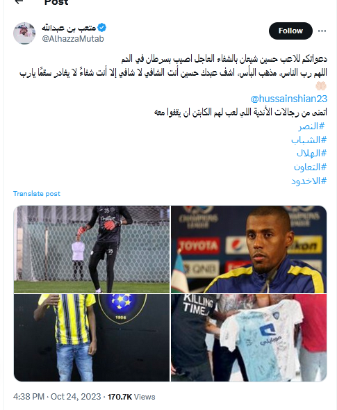 كما نشر الإعلامي متعب بن عبد الله تغريدة يعلن فيها إصابة شيعان ويطلب من الناس الدعاء له بالشفاء، موجهًا رسالة إلى رجال الأندية التي لعب لديها حارس المرمى بالوقوف معه في تلك المحنة.
