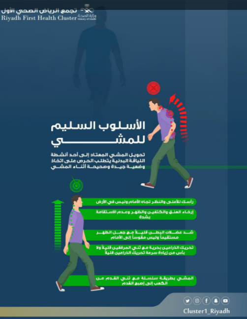 كشف تجمع الرياض الصحي الأول التابع لوزارة الصحة بالمملكة العربية السعودية عن الطرق الصحيحة للسير في الشوارع بمناسبة احتفال العالم بيوم المشي وذلك من خلال تحويل المشي إلى نشاط لياقة بدنية.