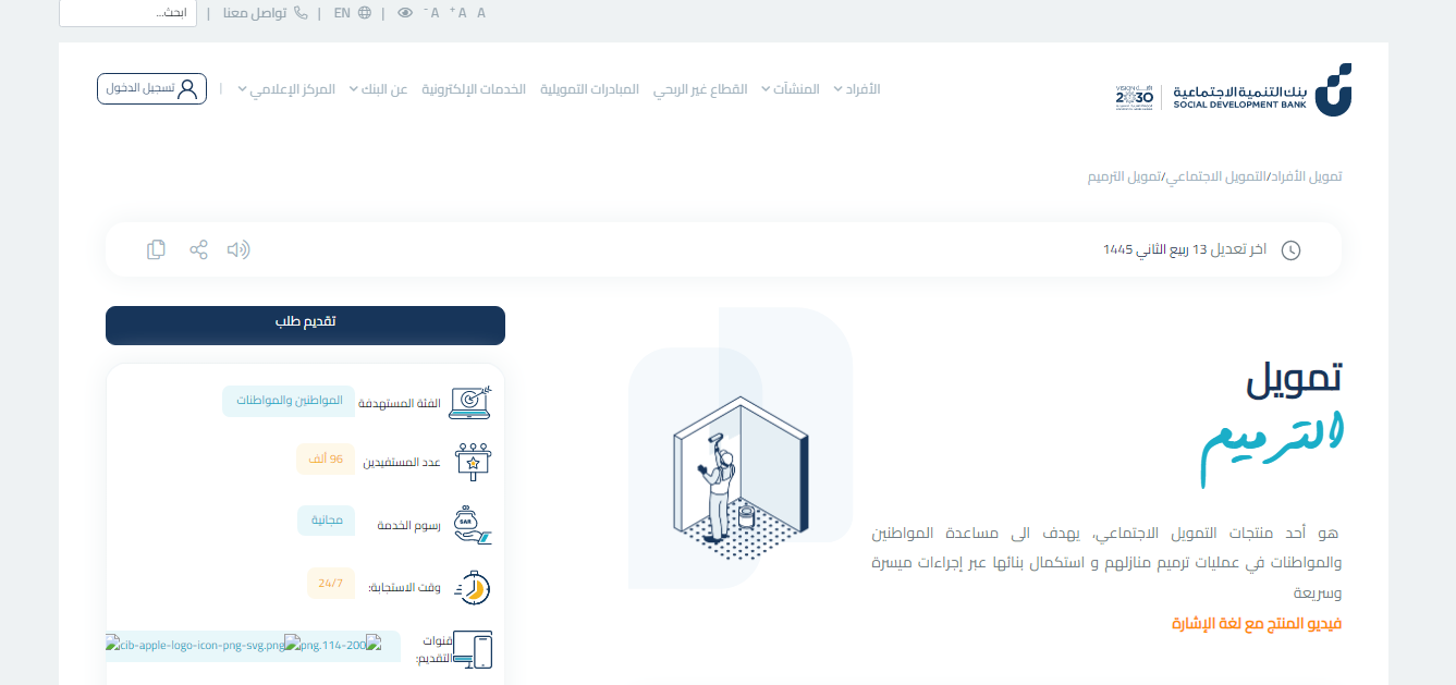 - الولوج إلى موقع بنك التنمية الاجتماعية صفحة تمويل الترميم.