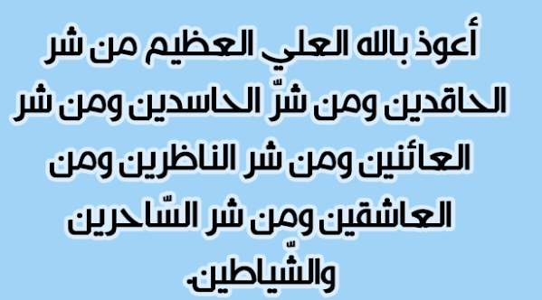 - بسم الله أرقي نفسي وأحصن نفسي من كل سوء ومن كل شيء يؤذيني، ومن كل عين حاسد أو حاقد يحسدني.