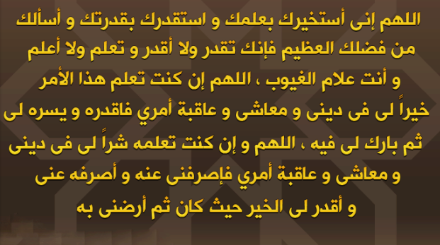 "اللَّهُمَّ إنِّي أَسْتَخِيرُكَ بِعِلْمِكَ، وَأَسْتَقْدِرُكَ بِقُدْرَتِكَ، وَأَسْأَلُكَ مِنْ فَضْلِكَ الْعَظِيمِ فَإِنَّكَ تَقْدِرُ وَلا أَقْدِرُ، وَتَعْلَمُ وَلا أَعْلَمُ، وَأَنْتَ عَلامُ الْغُيُوبِ..