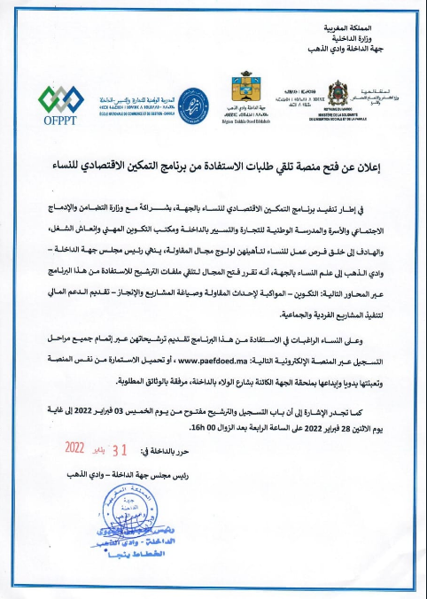 في سياق القيام بتنفيذ برنامج تمكين الاقتصادي للنساء وبالشراكة مع وزارة التضامن والإدماج الاجتماعي والأسرة والمدرسة الوطنية للتجارة، والتسسير بالداخلة ومكتب التكوين المهني وإنعاش الشغل والهدف إلى خلق فرص عمل للنساء للتأهيل بالدخول إلى مجال المقاولة.