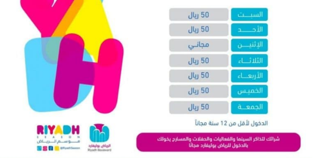 - سعر تذكر دخول أيام الأسبوع إلى 100.00 ريال سعودي.