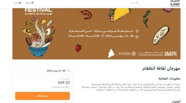 في إطار التعرف على متى يبدأ مهرجان ثقافة الطعام في المملكة العربية السعودية، فيرجى العلم بأن تذكرة الدخول إلى المهرجان تكون موحدة السعر الذي هو 30 ريال سعودي للفرد الواحد، ويمكن حجز تذاكر مهرجان ثقافة الطعام بشكل مبسط من خلال ما يلي من خطوات: