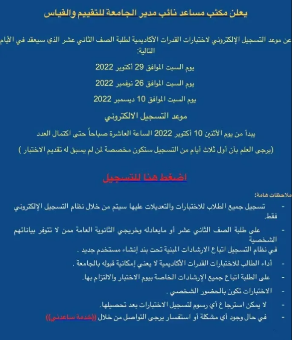 يرجى العلم بأنه يتم التسجيل من أجل الدخول إلى اختبار القدرات في جامعة دولة الكويت العربية من خلال الانتقال بشكل مباشر إلى نظام التسجيل الإلكتروني عن طريق الرابط portal.ku.edu.kw.