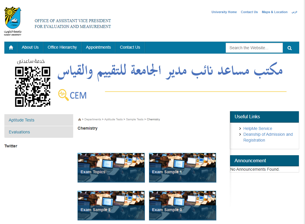 من الجدير بالذكر أن جامعة دولة الكويت العربية قد أتاحت مجموعة من الاختبارات من أجل قياس وفهم الطالب لمادة الرياضيات، والتي أطلقتها مرة باللغة الإنجليزية ومرة أخرى باللغة العربية.