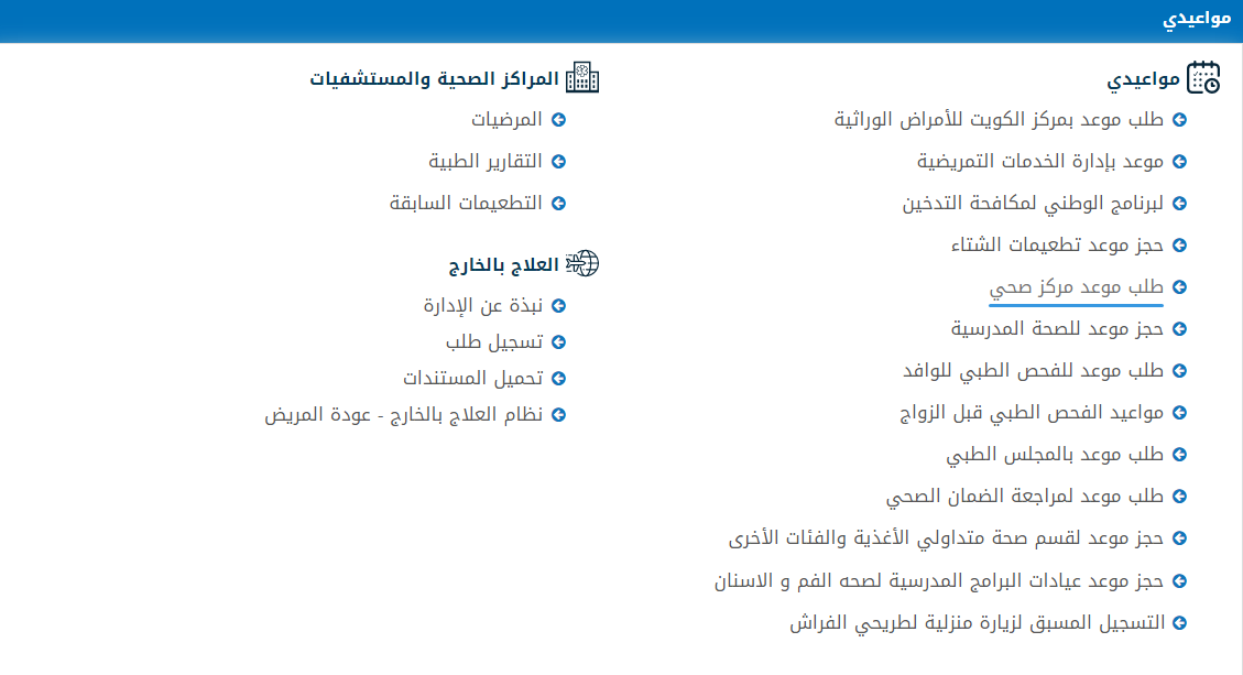 - تحديد خدمة حجز موعد مركز صحي من سلسلة الخدمات المعروضة تحت تبويب باسم مواعيدي.