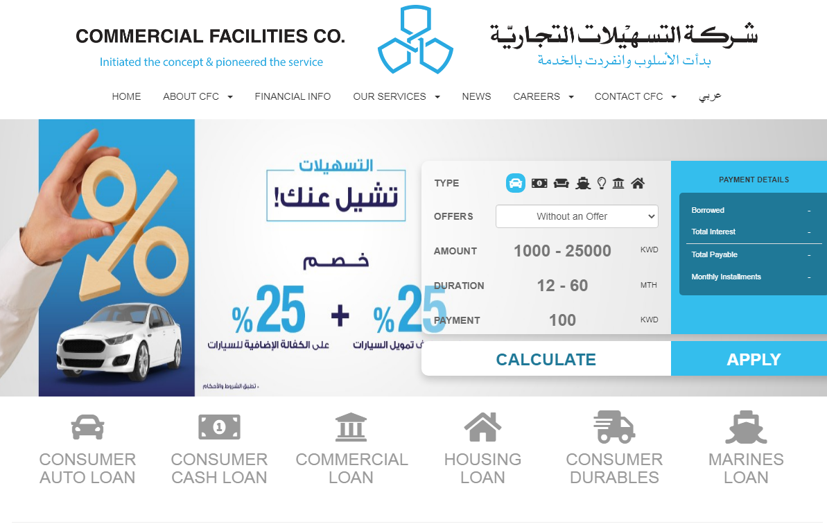 - قروض السيارات والتي يصل الحد الأعلى لها إلى 25000 دينار كويتي.