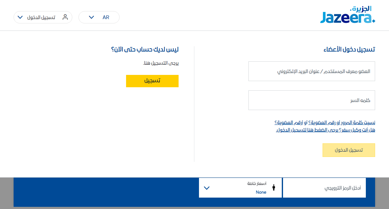 - النقر على تبويب تسجيل الدخول واختيار مسافر من القائمة المنسدلة.