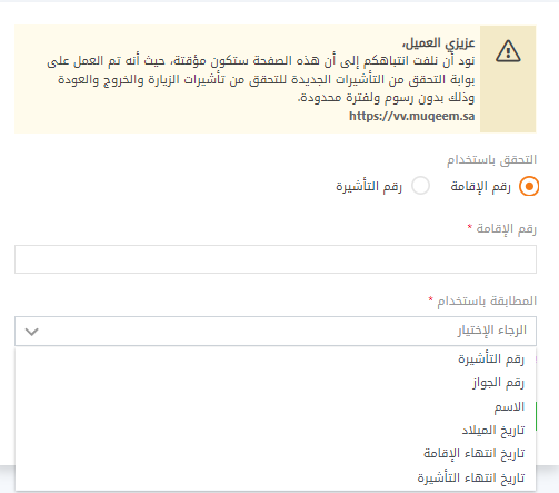 - تحديد طريقة الاستعلام إما برقم الإقامة أو برقم التأشيرة.