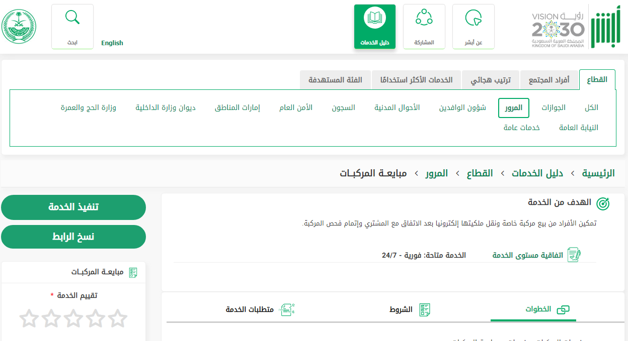 - يُشترط أن يتم سداد رسوم خدمة مبايعة المركبة من خلال نظام المدفوعات الحكومية "سداد".