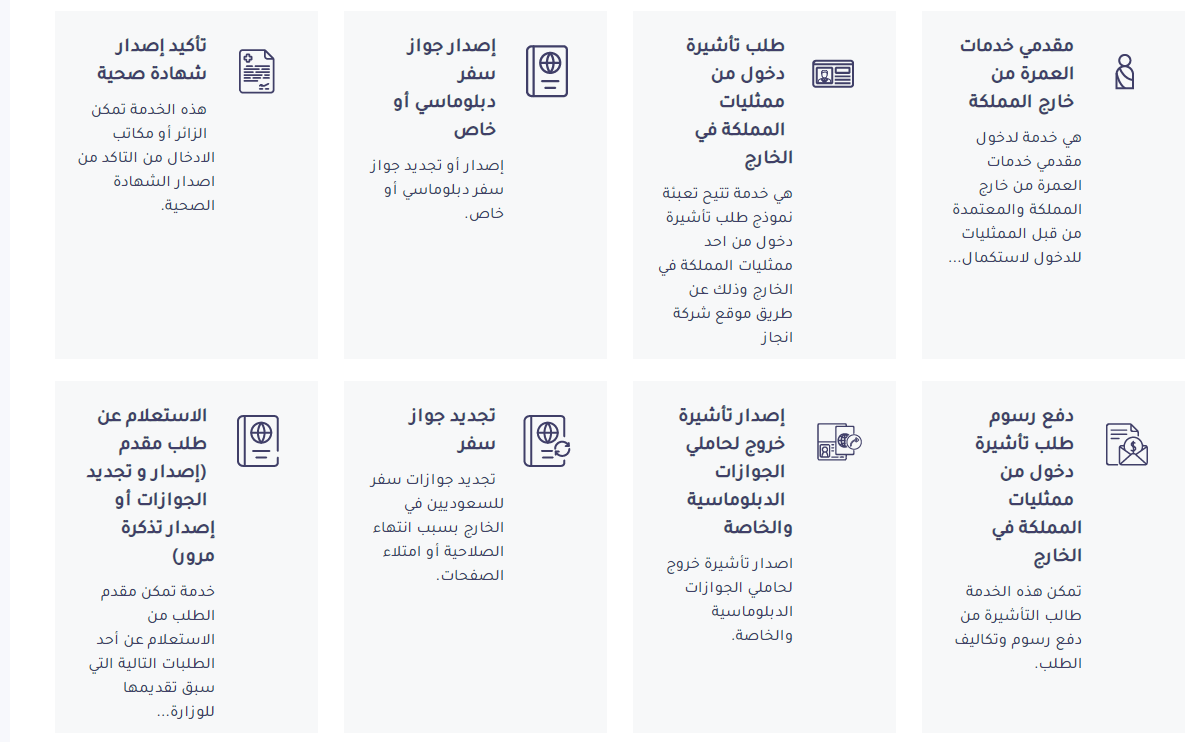 إن الجوازات وبالتعاون مع وزارة الخارجية داخل السعودية تقوم بتقديم العديد من الخدمات الإلكترونية إلى مختلف فئات الأشخاص في المملكة من المقيمين والمواطنين بغرض التسهيل عليهم في إجراء بعض الخدمات مثل خدم الاستفسار عن طلب مقدم إلى وزارة الخارجية، وذلك عن طريق الدخول إلى خدمة الاستعلام عن طلب زيارة عائليه رابط.