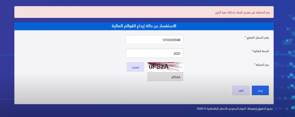 - ادخل بيانات الاستعلام المطلوبة (رقم السجل المدني، والسنة المالية، ورمز الحماية الظاهر على الشاشة).