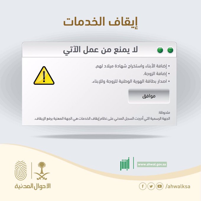 هذا أيضًا ما عملت الأحوال المدنية على توضيحه مؤكدة على أن إيقاف الخدمات لا يمنع الفرد من إضافة أبنائه سواءً كانت أمهم سعودية أو غير سعودية، كما أنه يحق له استخراج شهادات ميلاد لهم.