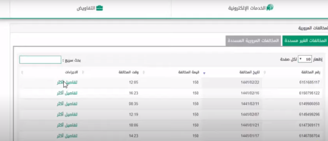سوف يتم استعراض مفردات المخالفة المرورية على الموقع في غضون ثوان.