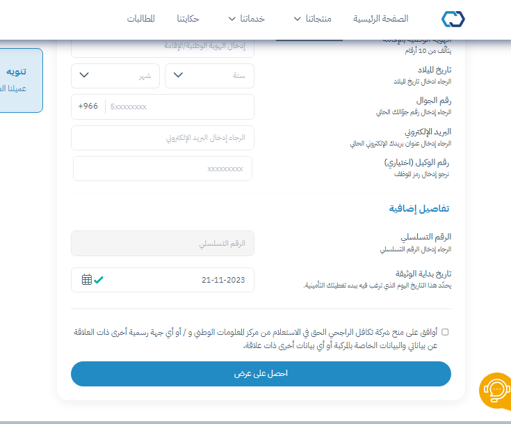 - حدد خانة أوافق على منح شركة تكافل الراجحي الحق في الاستعلام من مركز المعلومات الوطني أو أي جهة رسمية أخرى ذات العلاقة عن بياناتي والبيانات الخاصة بالمركبة أو أي بيانات أخرى ذات علاقة.