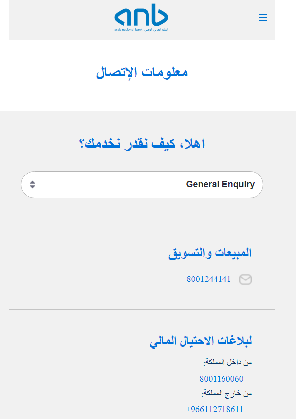 رقم هاتف البنك العربي الوطني ANB