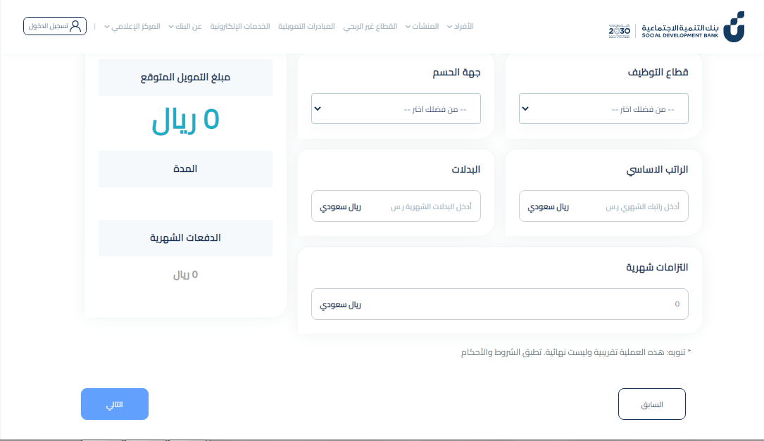 - قم بتعبئة البيانات المالية لكل من رب الأسرة، والأفراد (البدلات، والراتب الأساسي، والالتزامات الشهرية).
