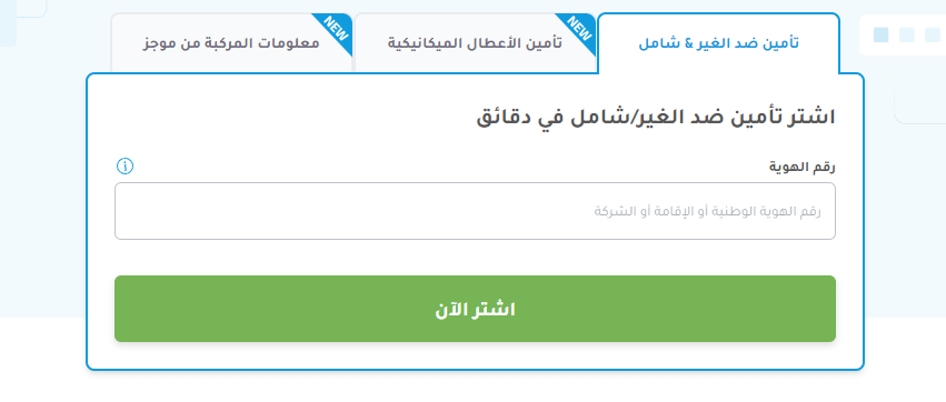 - اختيار نوع الخدمة المطلوبة إما تأمين شامل وتأمين ضد الغير، أو تأمين الأعطال الميكانيكية أو معلومات المركبة من موجز.