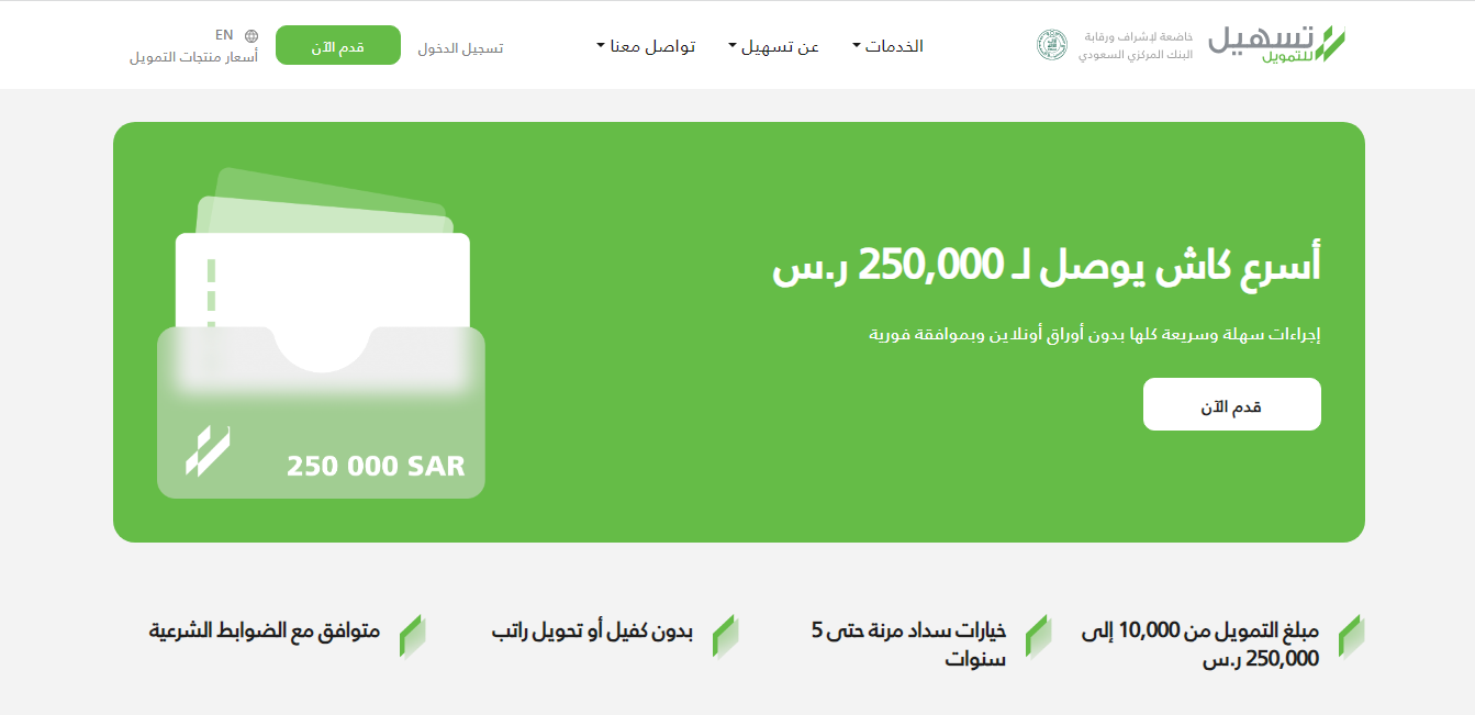 - مبلغ التمويل النقدي حتى 250،000 ريال سعودي.