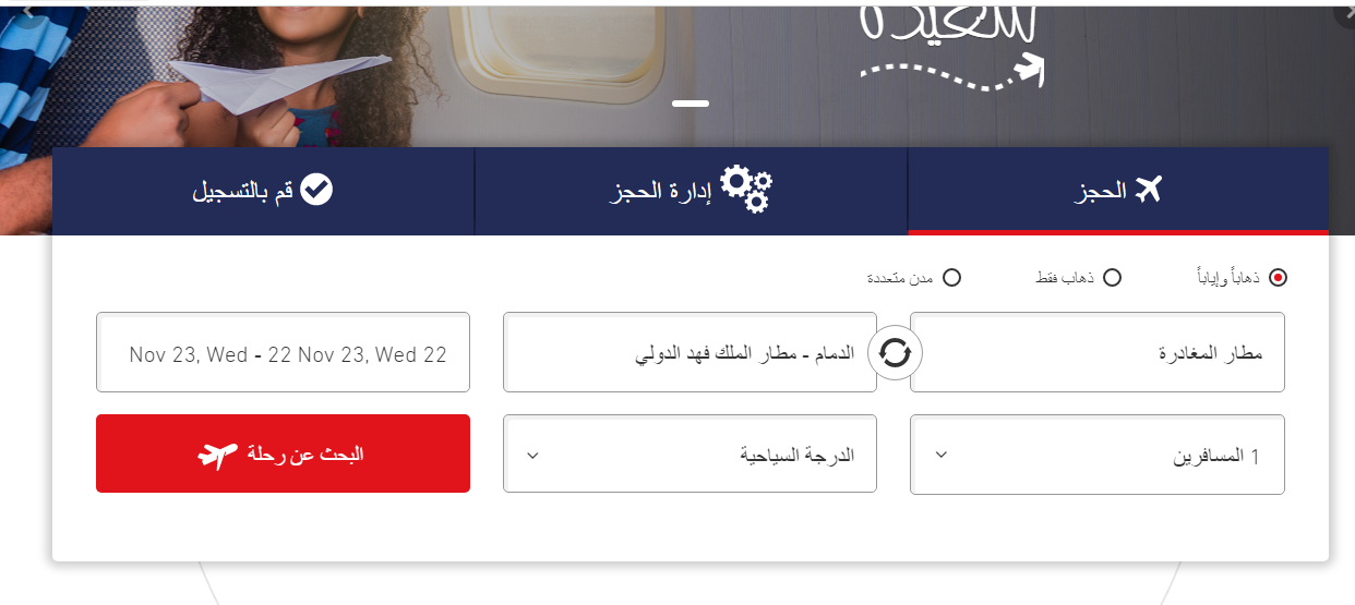 - ادخل باقي بيانات التذكرة (تاريخ العودة، وتاريخ المغادرة، وعدد المسافرين، ونوع الدرجة).
