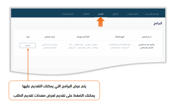 - عند برنامج دعم مستفيدي الضمان، اضغط على علامة التبويب "تقديم".