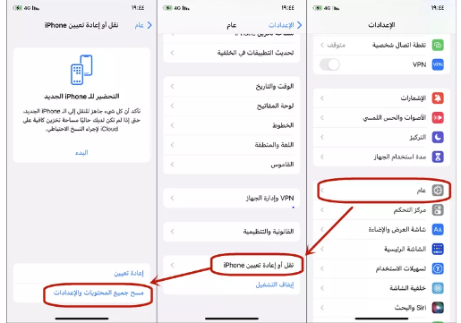 - العمل على الدخول إلى خيار نقل وإعادة تعيين الآيفون، مع العمل على تحويل الهاتف إلى وضع إعادة ضبط المصنع.