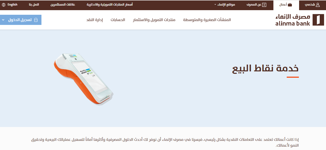 تجدر الإشارة إلى أن مصرف الإنماء يوفر لعملائه من أصحاب الأعمال باقة فريدة ومميزة من الخدمات المصرفية المصممة لتنظيم وإدارة العمليات النقدية من خلال خدمة نقاط البيع التي تتيح للعملاء خيارات دفع سريعة وآمنة لتسديد قيمة المشتريات إلكترونياً ، ويمكن الحصول على الجهاز من خلال تقديم طلب بصورة إلكترونية عبر الموقع الرسمي للبنك في حالة توافر الشروط المفروضة.