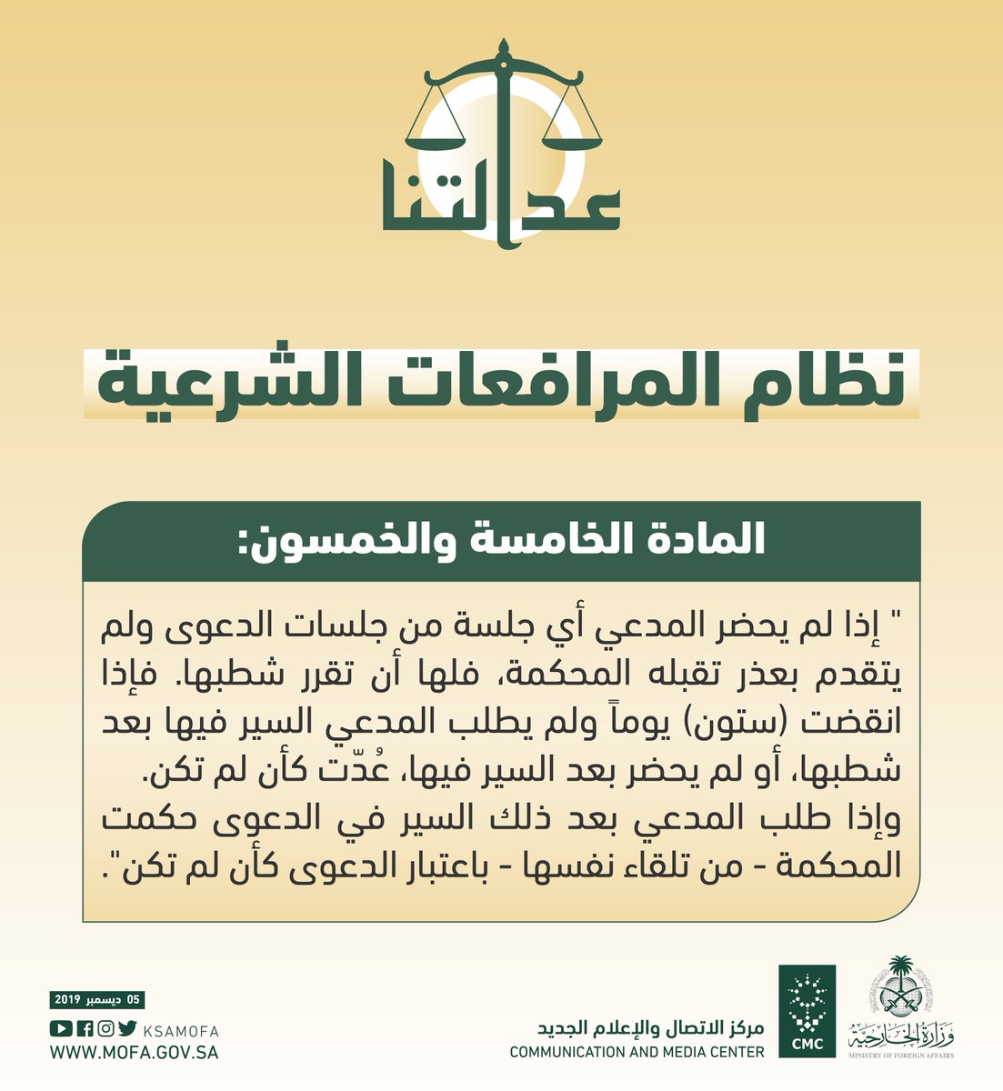 بحسب ما تم ذكره في نظام المرافعات الشرعية في المملكة العربية السعودية أن غياب المدعي يؤدي إلى شطب القضية، إلا أنه وجب العلم أن نفس المادة الخامسة والخمسين تتضمن أيضًا حق إعادة رفع الدعوى مرة أخرى من قِبل المُدعي.