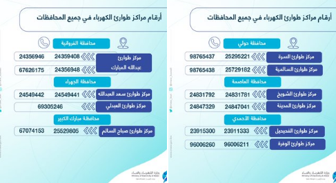 في إطار التعرف على كيف ابلغ عن انقطاع الكهرباء رقم طوارئ الكهرباء الكويت، نتعرف من خلال ما يلي على كافة أرقام فروع طوارئ الكهرباء في دولة الكويت بشكل مفصل: