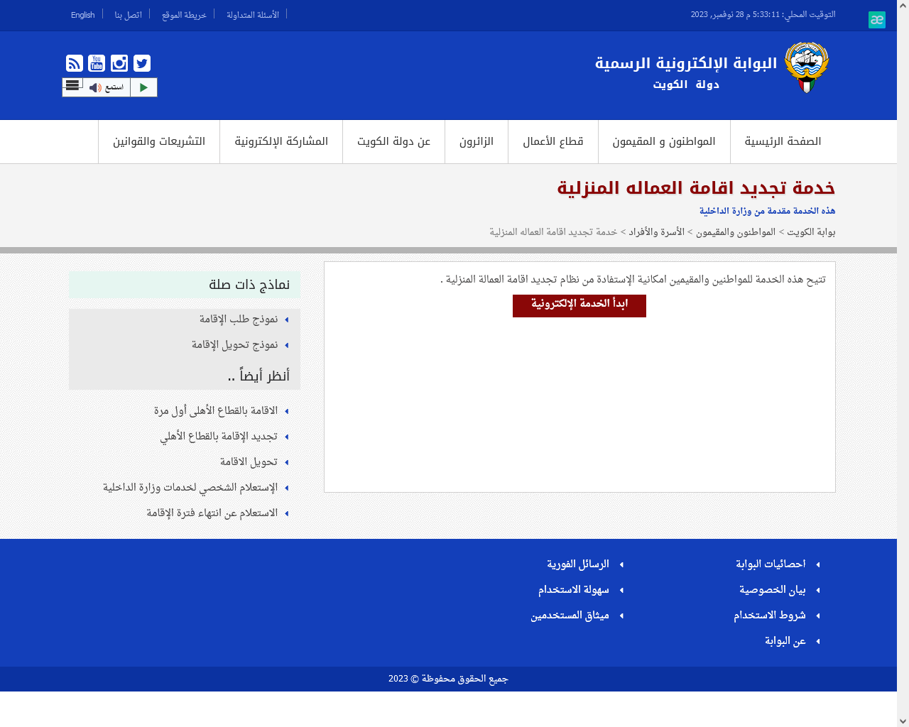توفر منصة وزارة الداخلية إمكانية تجديد إقامة العمالة المنزلية للمواطنين في الكويت وذلك عبر الإدارة العامة لشؤون الإقامة، وبعد التحقق من استيفاء المقيم والكفيل لكافة الشروط اللازمة، ويتم ذلك من خلال اتباع الخطوات التالية: