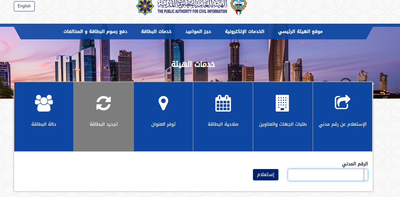 توفر الهيئة العامة للمعلومات المدنية لجميع المواطنين الكويتيين والمقيمين في دولة الكويت إمكانية تجديد البطاقة المدنية التي انتهت صلاحيتها بشكل إلكتروني، وذلك عن طريق موقعها الرسمي بجانب الخدمات الأخرى التي تُقدمها.