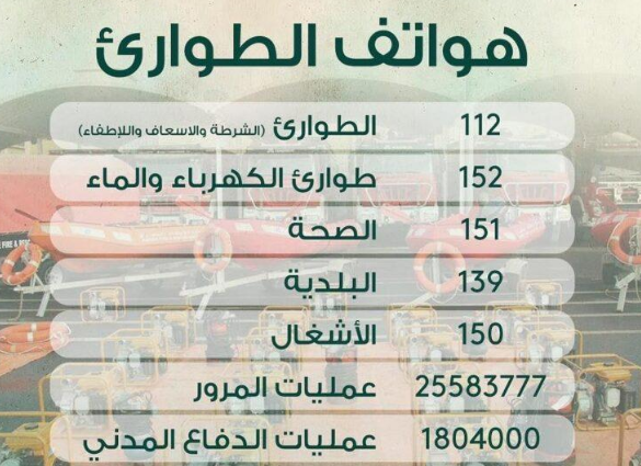 - رقم الإطفاء والشرطة والإسعاف: 122