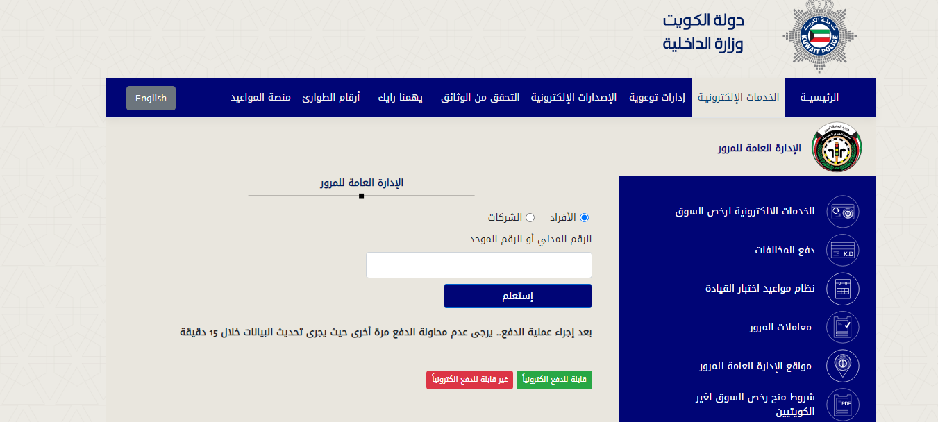 يمكن الآن المواطنين الكويتيين والوافدين المقيمين في دولة الكويت دفع مخالفات المرور بشكل إلكتروني، وذلك عن طريق اتباع الخطوات الآتية: