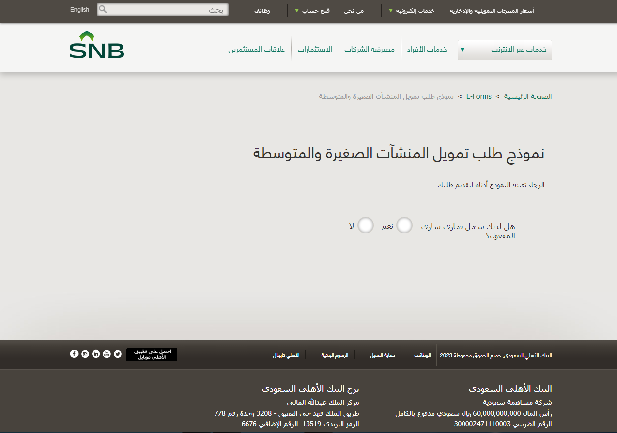 ومن خلال دخولك إلى هذا الرابط التابع للموقع الرسمي للبنك الأهلي السعودي، يمكنك تقديم طلبك بالحصول على قرض تجاري بسهولة ويُسر.
