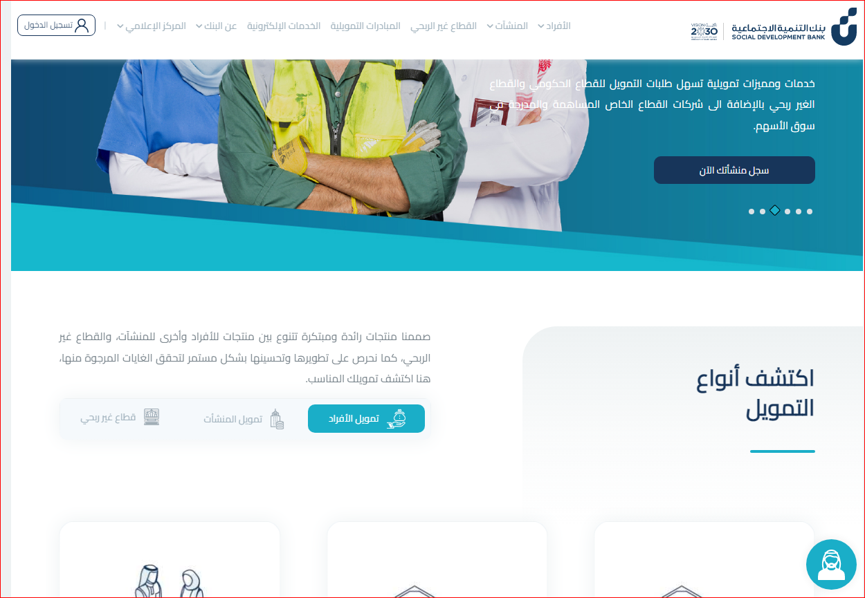 - قم بالدخول إلى الصفحة الرسمية لتمويلات بنك التنمية الاجتماعية.