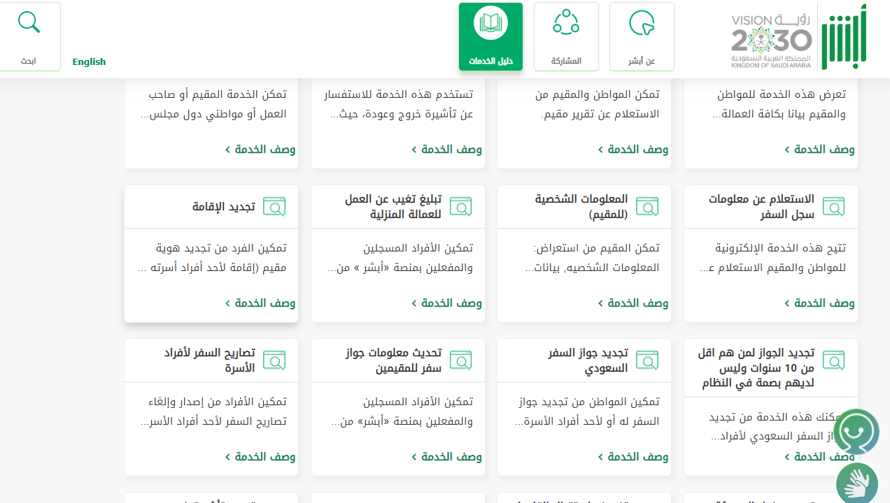 - من ثم العثور على أيقونة "تجديد الإقامة"، والنقر على زر "وصف الخدمة".