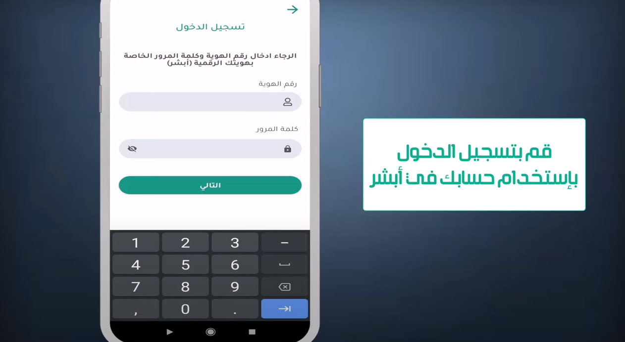 - يتم الانتقال إلى صفحة أخرى وفيها يقوم المستخدم بتدوين رقم هويته بالإضافة إلى كلمة مرور للحساب.