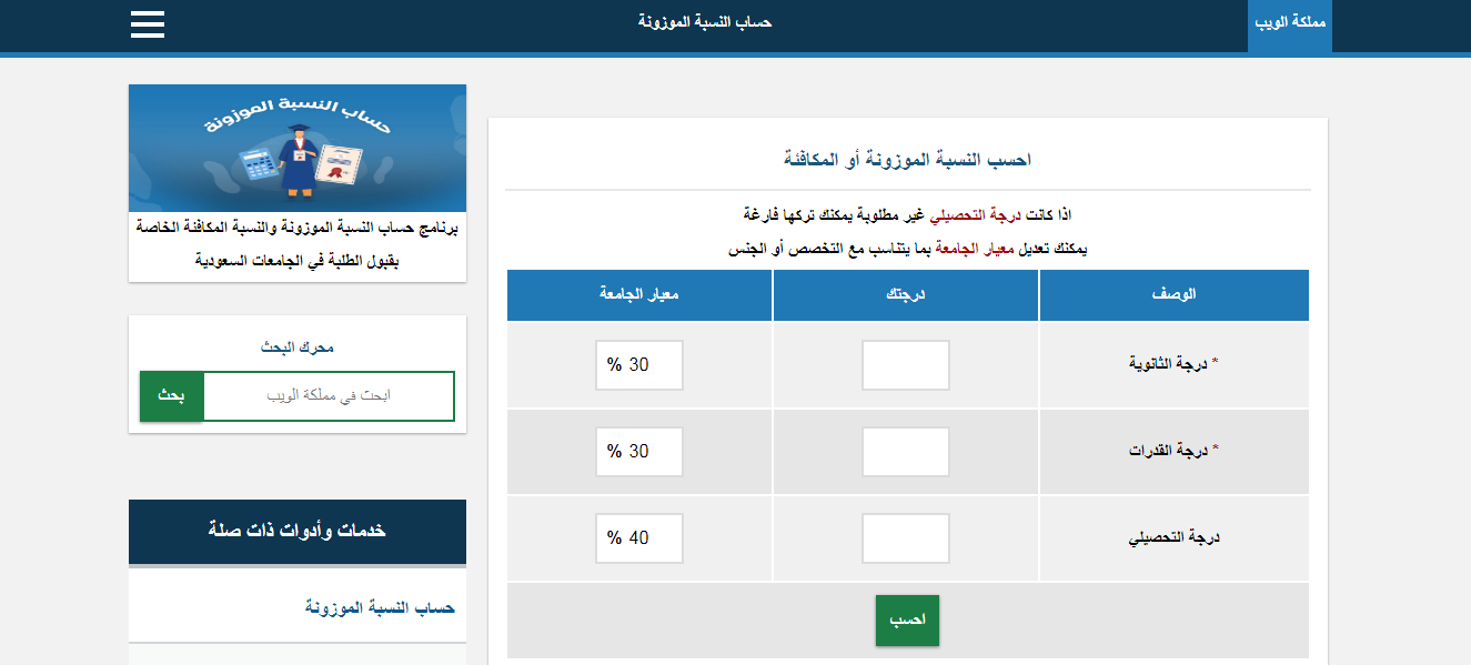 - التوجه إلى موقع حاسبة النسبة الموزونة للجامعات.