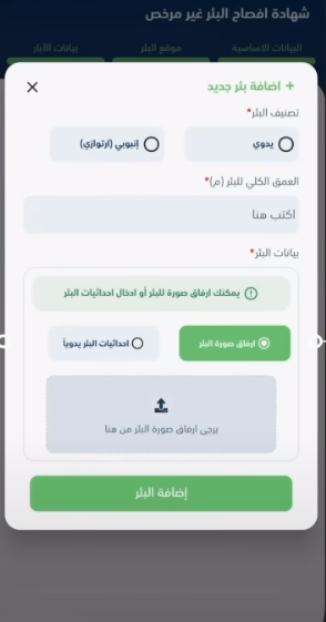 - في حال التواجد في موقع البئر قمّ بإرفاق صورة للبئر، أمّا في حال عدم التواجد قمّ بإضافة إحداثيات البئر.
