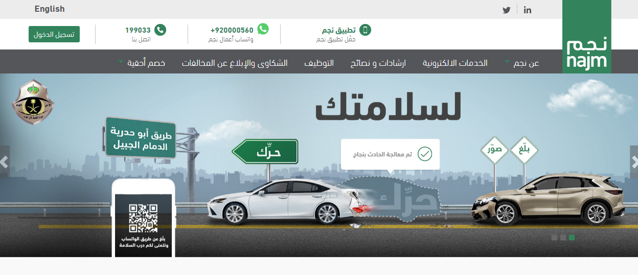 أتاحت إدارة المرور العامة في السعودية بالتعاون مع البنك المركزي السعودي «ساما» لجميع المتواجدين على أرض المملكة بالإبلاغ عن جميع الحوادث الواقعة على الطرق من خلال بوابة نجم.