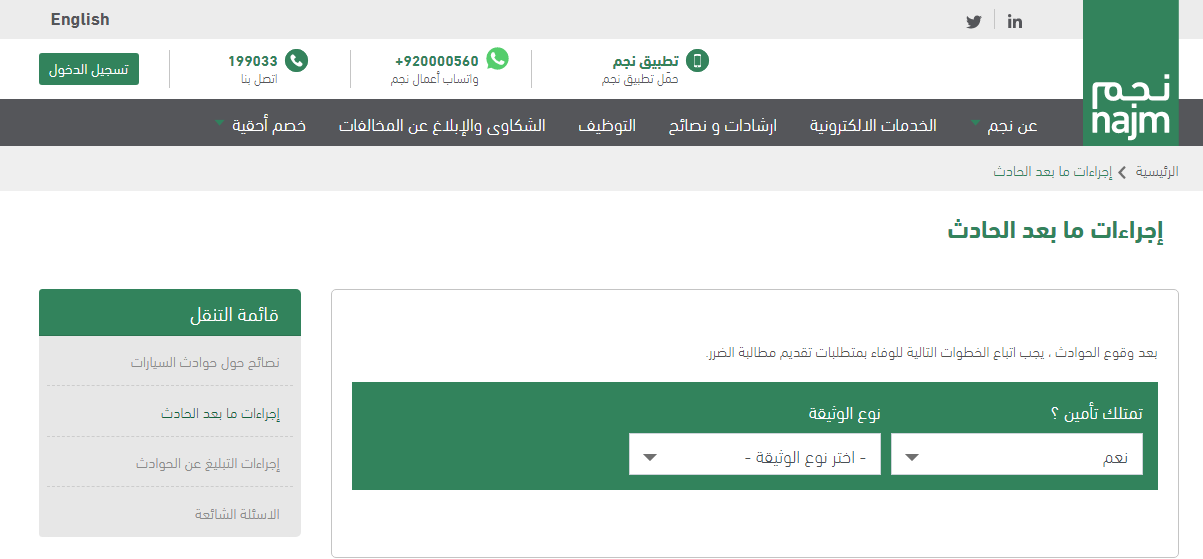 بهذا يكون قد تم عرض الطريقة التي يتم من خلالها الإبلاغ عن حادث بالإضافة إلى المزيد من التفاصيل الخاصة بالتعامل مع شركة نجم والطريقة التي يمكن من خلالها الاستعلام عن الحادث وإجراءات ما بعد وقوع الحادث.