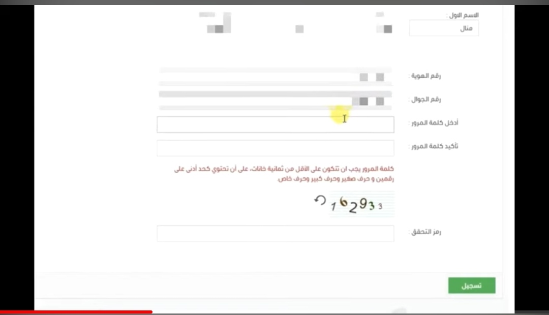 - ملء بيانات، الاسم، رقم الهوية، رقم الجوال، كلمة المرور ورمز التحقق.