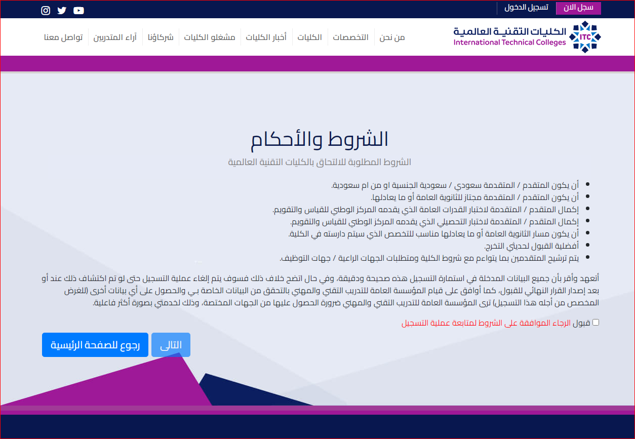 - اضغط على "موافقة" بعد الاطلاع جيدًا على شروط التسجيل في الكلية.