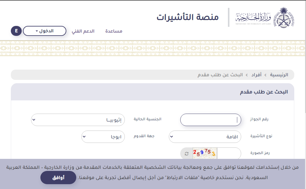 - قم بإدخال رقم الطلب والرمز المرئي والجنسية ونوع التأشيرة وجهة القدوم.