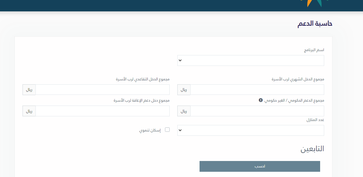 - ثم قم بادخال بيانات الاستعلام المطلوبة من حيث (مجموع الدخل الشهري للأسرة، ومجموع دخل دعم الإعاقة لرب الأسرة، ومجموع الدعم الحكومي أو غير الحكومي، ومجموع الدخل التقاعدي لرب الأسرة، وعدد المنازل).