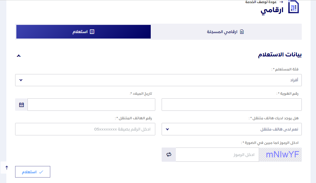 - ادخل بيانات الاستعلام (رقم الهوية، أو رقم السجل التجاري، أو رقم المتنقل إن وجد، وتاريخ الميلاد،).